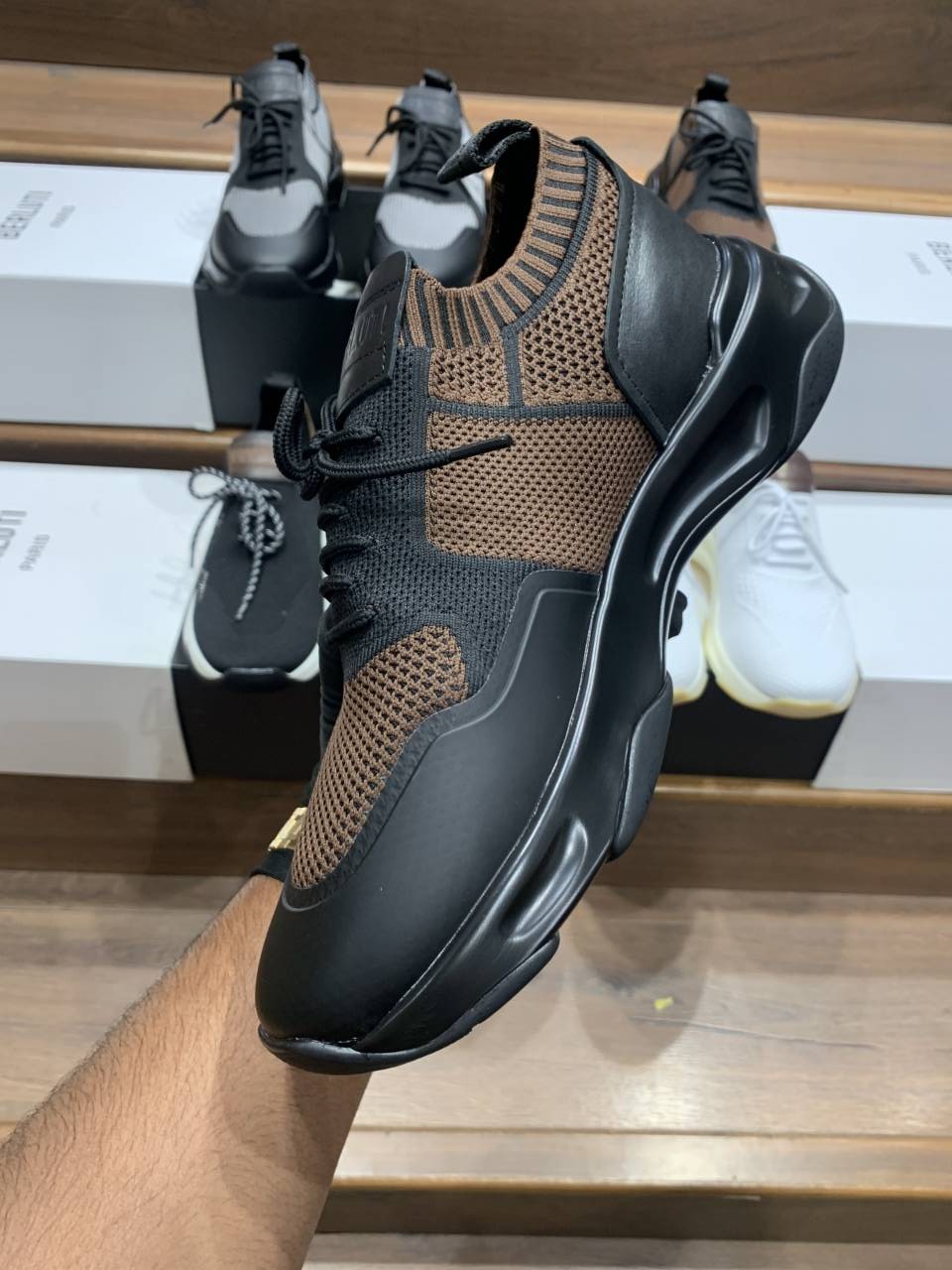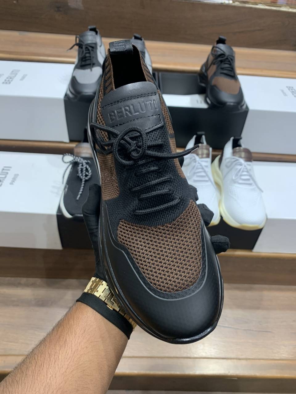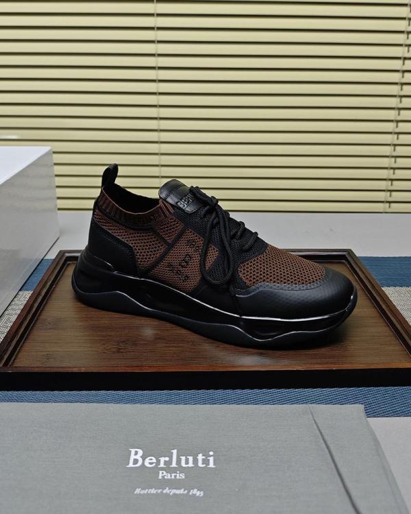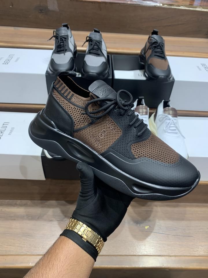 BERLUTI BROWN SHADOW COATED KNITAND CLAF LEATHER SNEAKER