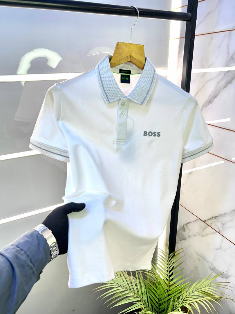 Hugo_Boss White Embossed Logo Print Premium Collar Neck Polo T-shirt F1691-WH